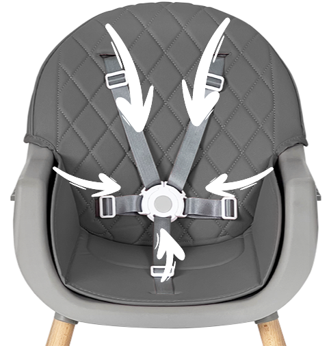 Five attachment points designed to restrain your child at the shoulders and hips, which are the most rigid parts of their body.